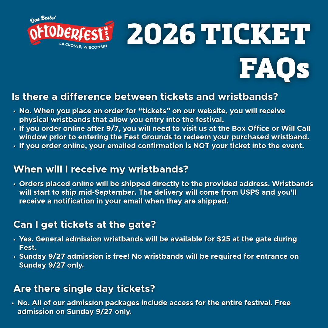All attendees aged 13 and older will need a valid wristband to enter the Fest Grounds from Thursday, 9/24 through Saturday, 9/26. Sunday, 9/27 is FREE admission day—no wristband required!